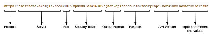https://hostname.example.com:2087/cpsess##########/json-api/accountsummary?api.version=1&user=usernameWHM API 1 calls through JSON consist of the following basic parts: