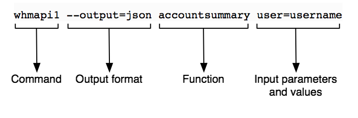 WHM API 1 calls through the command line consist of the following basic parts: